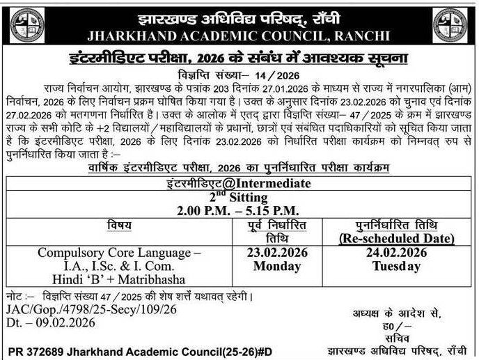 Jharkhand Academic Council (JAC), Ranchi has officially confirmed the examination dates for the Class 12th (Intermediate) Board Examination 2026. As per the notification, the annual board examinations will be conducted from 03 February 2026 to 24 February 2026 across the state.